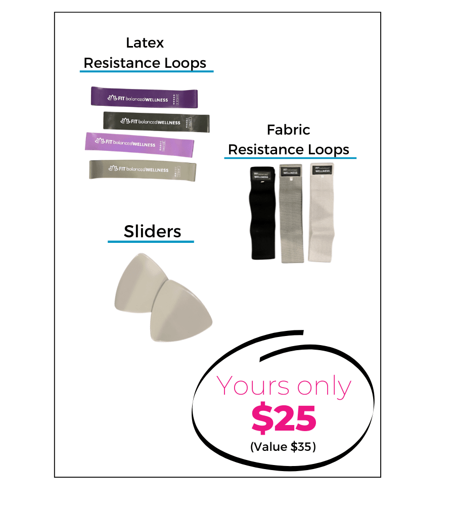 Resistance Loops & Sliders ($25): Add on the workout equipment you need to maximize results. Included is a set of 4 latex AND 3 fabric resistance loops, as well as a set of sliders. (Free Shipping!)